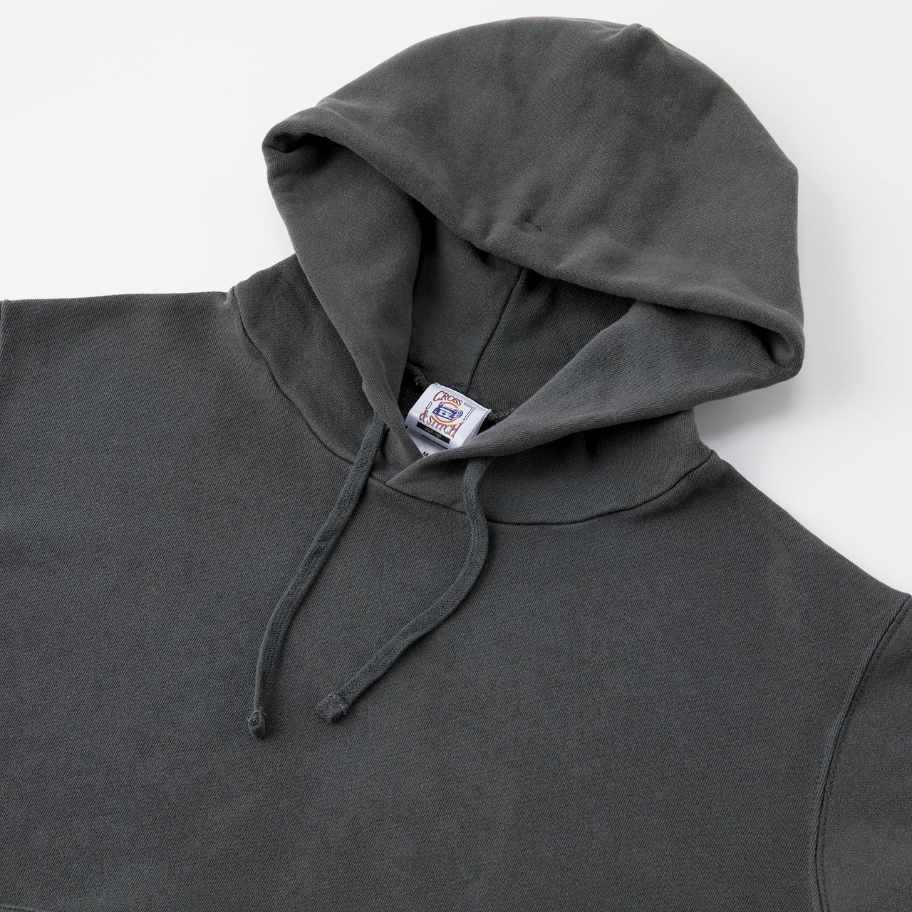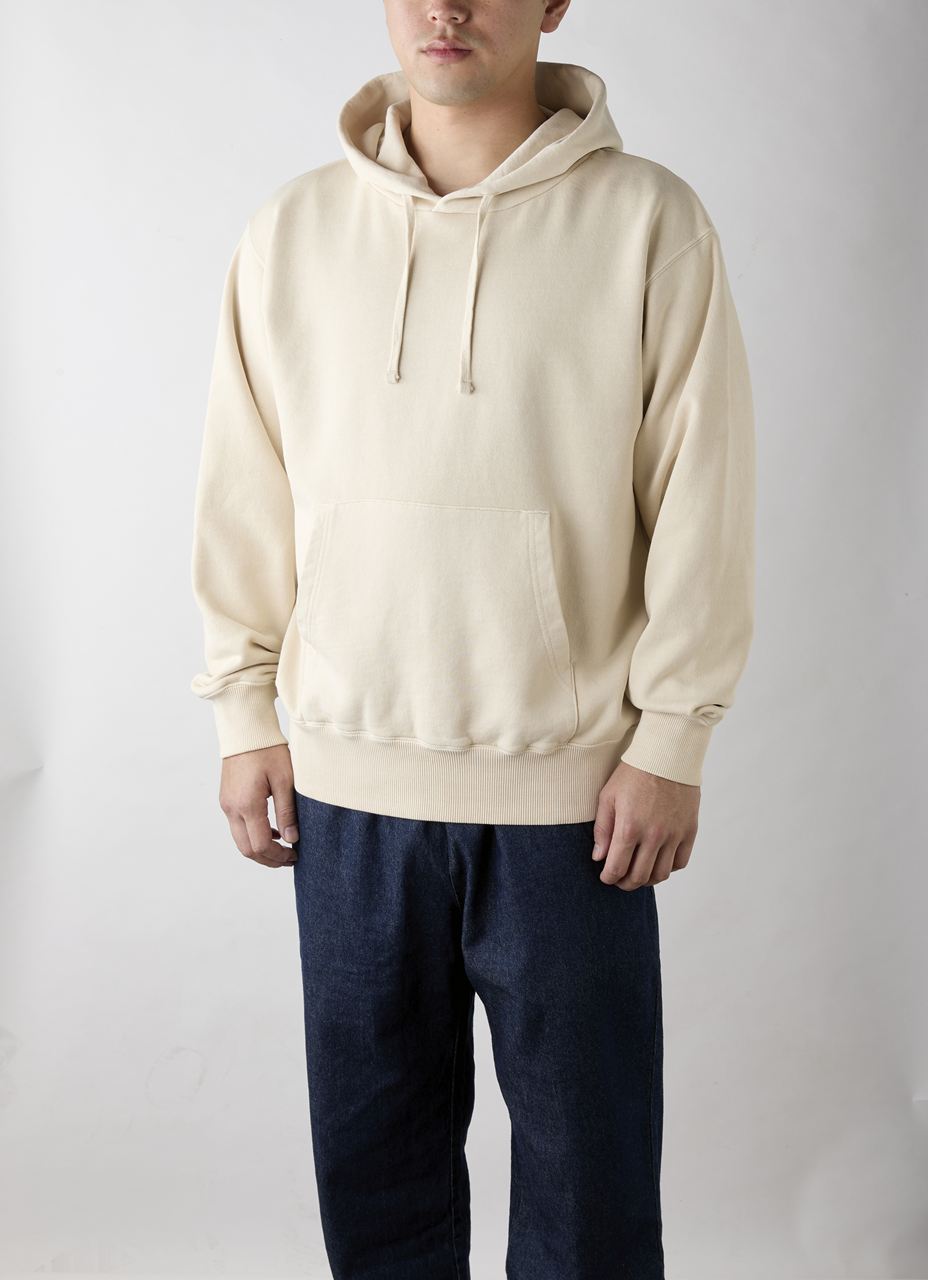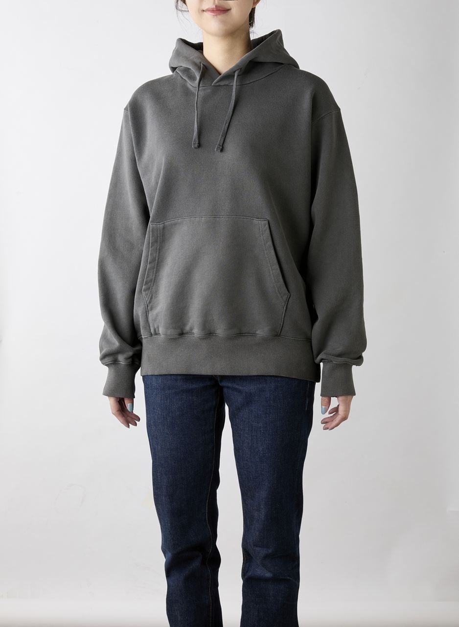 ピグメント(顔料)染めの裏毛パーカ!裏糸をOE(オープンエンド糸)にすることでシャリ感のある肌触りに!